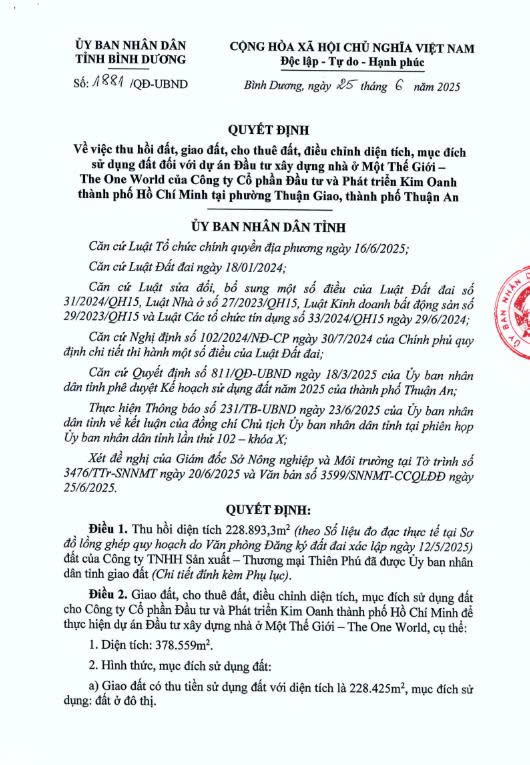 Đến ngày 09/01/2024, UBND tỉnh Bình Dương tiếp tục ban hành Quyết định chấp thuận chủ trương đầu tư và nhà đầu tư mới, chính thức cho phép Công ty Cổ phần Đầu tư và Phát triển Kim Oanh TP. HCM triển khai và phát triển dự án theo định hướng mới.