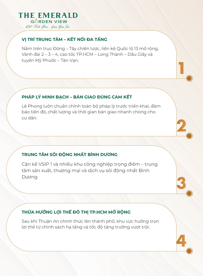 Xu thế đô thị hóa đang lan rộng từ TP.HCM tạo ra làn sóng phát triển mạnh mẽ cho toàn khu vực. Hạ tầng giao thông ngày càng được hoàn thiện với nhiều dự án lớn đang triển khai. The Emerald Garden View hưởng lợi trực tiếp từ sự chuyển mình này khi nằm ngay tại tâm điểm của quá trình phát triển. Vị trí dự án đáp ứng hoàn hảo nhu cầu sống kết nối của cư dân hiện đại. Đồng thời, tiềm năng gia tăng giá trị bền vững trong tương lai gần là điều hoàn toàn có thể kỳ vọng khi khu vực tiếp tục phát triển theo quy hoạch tổng thể.