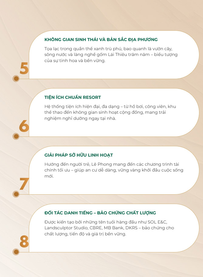| Biệt thự nghỉ dưỡng | Không phát triển biệt thự nghỉ dưỡng; tập trung vào căn hộ – thương mại |