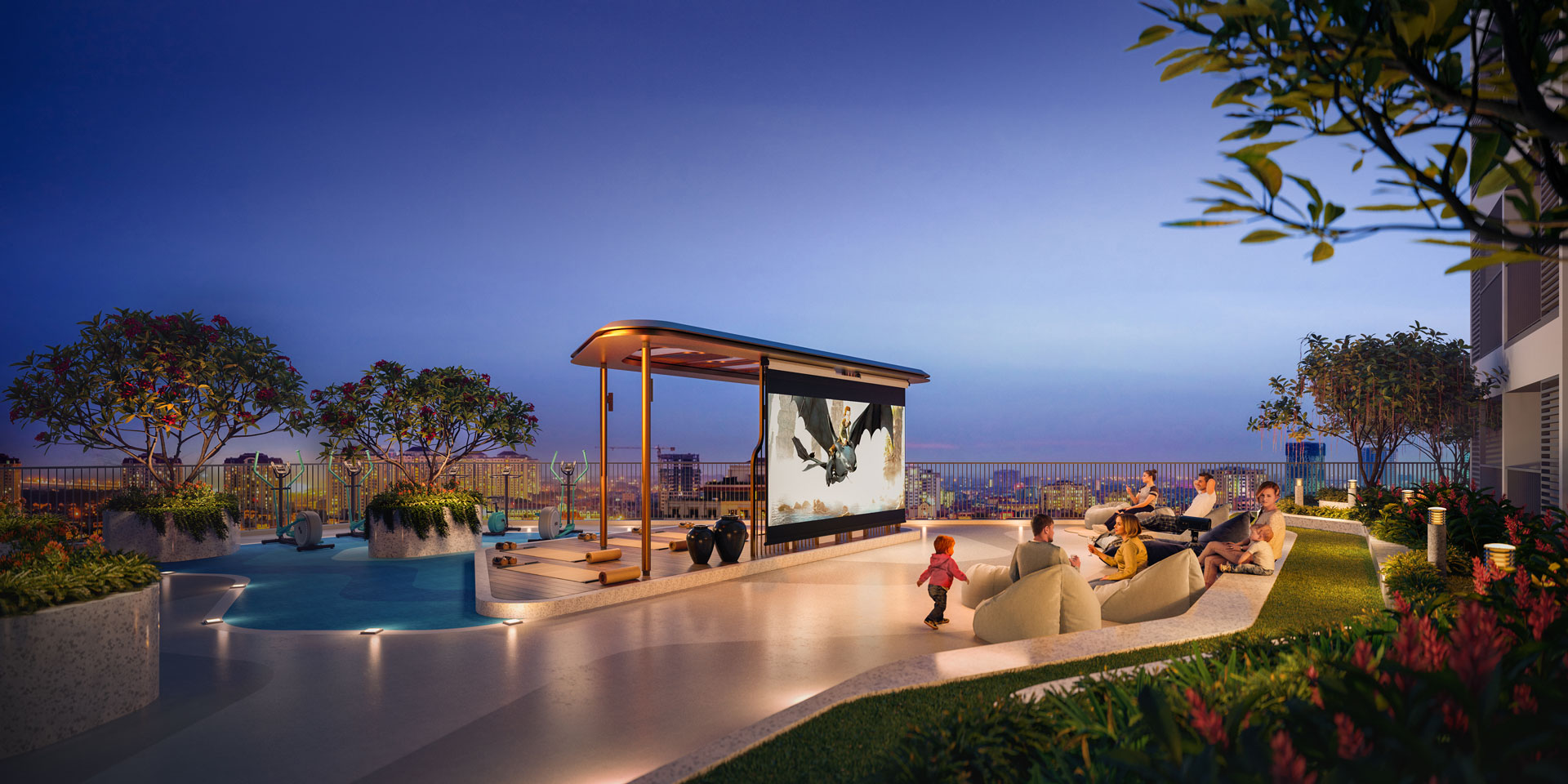 Phòng gym kết hợp khu vực yoga và sân thể thao ngoài trời, khuyến khích lối sống năng động.